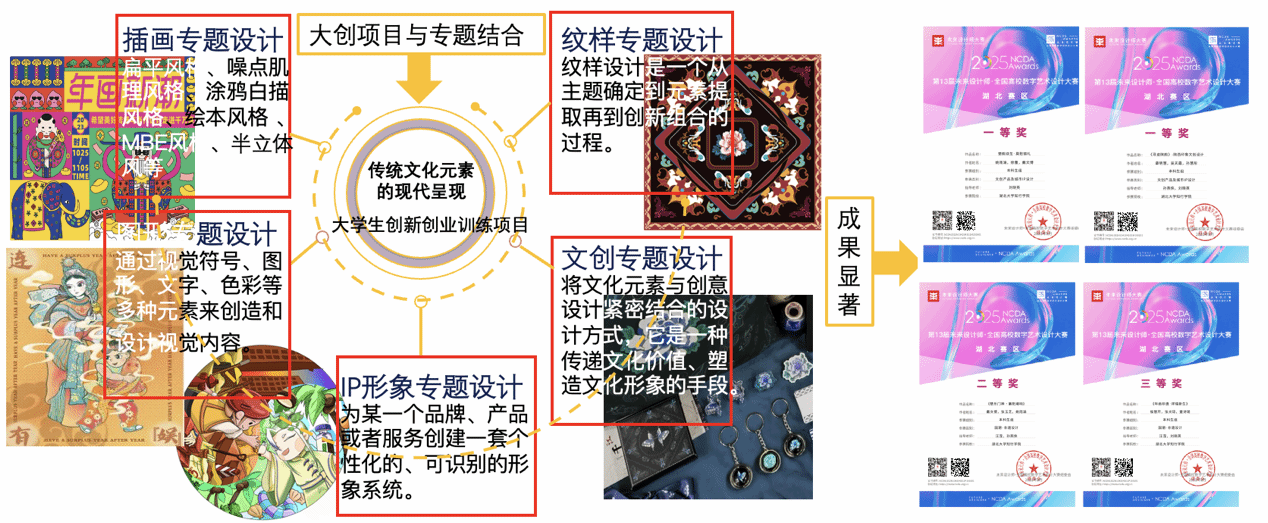 艺术与设计学院视觉传达专业,在教学中将综合实践课程内容专题模块化,将课程内容按照不同的主题、技能或项目类型进行划分,形成相对独立又相互联系的模块,学生可以根据自身兴趣、优势学科和职业规划选择学习路径。