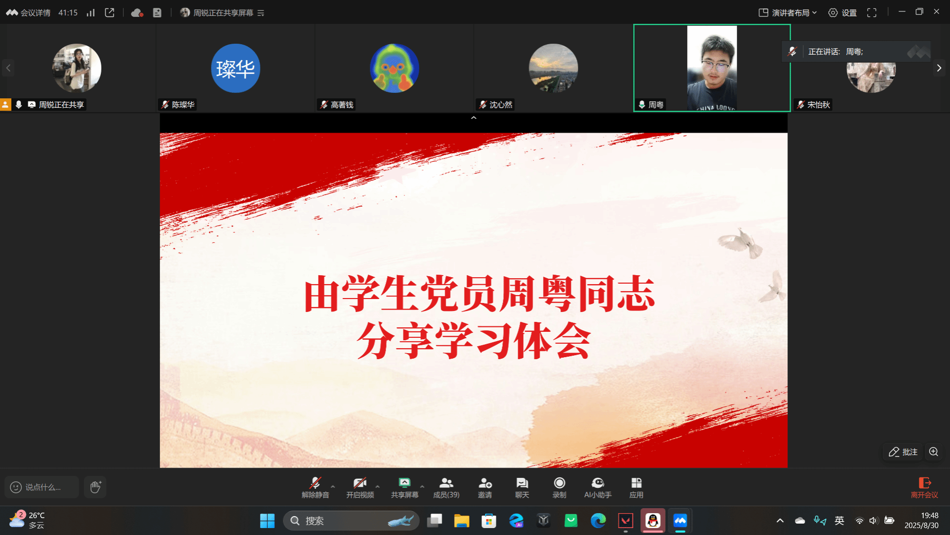 全体成员共同观看中国人民抗日战争暨世界反法西斯战争胜利80周年纪录片,那段艰苦卓绝的抗争历史,让大家深刻感悟到“落后就要挨打”的教训与“团结就是力量”的真理。学生党员沈心然同志结合纪录片内容分享学习体会,她表示,作为青年党员,要铭记先烈牺牲、传承抗战精神,以实际行动守护来之不易的和平。