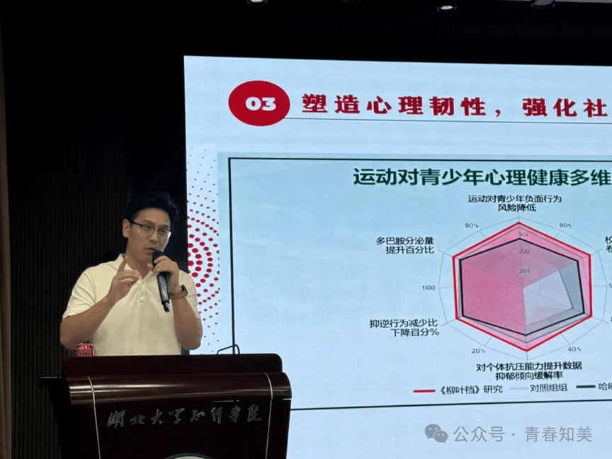 紧接着,殷老师通过一系列数据,展示了运动在调节心理情绪、优化心理效能、塑造心理韧性中的重要性。课程援引权威研究数据阐明运动对身心健康的双重赋能:规律性锻炼可使抑郁焦虑症状改善效果等同于专业治疗,高频次运动人群幸福感提升比例达46%-52%。这些科学依据为落实“健康第一”教育理念提供了实证支撑,更凸显了“文明其精神,野蛮其体魄”的现实意义。