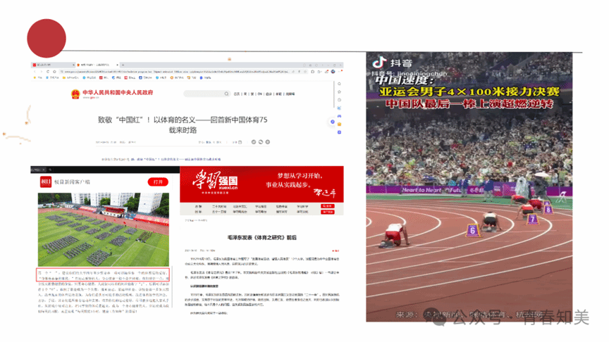 殷老师先通过两段视频展示了中国体育发展史,以史为鉴阐释了强健体魄并非个人问题,而关系到民族国家的兴亡。这一论述与习近平总书记提出的“使命在肩、奋斗有我”精神高度契合,彰显了体育育人的时代价值。