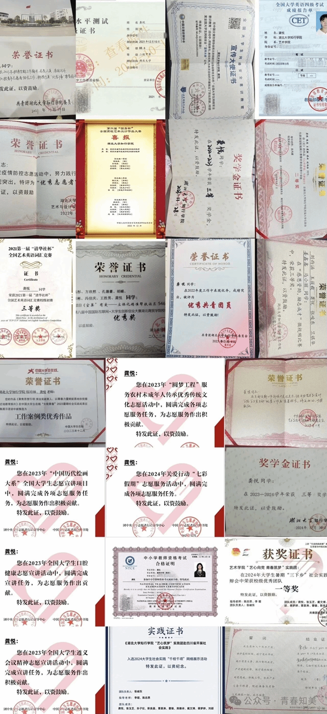 龚悦,湖北武穴人,中共党员,美术学2102班学生。2021年9月入学以来,始终以高标准要求自己。曾任院学生党支部宣传委员、班级生活委员,积极投身学生工作和社会服务,获评“优秀工作者”等7项荣誉。参与"中国历代绘画大系"等6项国家级志愿服务,多次参与团队赴湖北十堰、四川彝族自治县开展“三下乡”调研,实践成果入选教育部中国大学生在线暑期社会实践优秀工作案例(全国100件),团队获中国青年报“千校千项”展示、校级“三下乡”一等奖。参与支部外媒宣传工作,所在实践团被人民日报等20余家媒体先后报道。在学术方面,以优异成绩发挥先锋模范作用,斩获国青杯艺术设计大赛三等奖、“互联网+”创新创业优秀奖等多项荣誉,取得英语四级、高中教资证书,多次荣获奖学金。始终秉持"知行合一"的信念,展现了新时代大学生全面发展的优秀风貌。