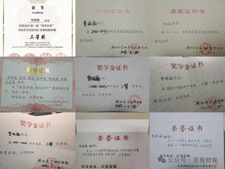 我是美教2102班毕业生曾晓薇。在校期间,始终以高标准要求自己,多次荣获学院奖学金。积极参与校艺术团工作活动,担任女中负责人,组织队员参与五一表彰大会和学校师生合唱比赛等十余场活动,提升了组织协调与团队协作能力。未来,我将带着母校赋予的智慧与勇气,继续拼搏,以青春之我,创造青春之未来。