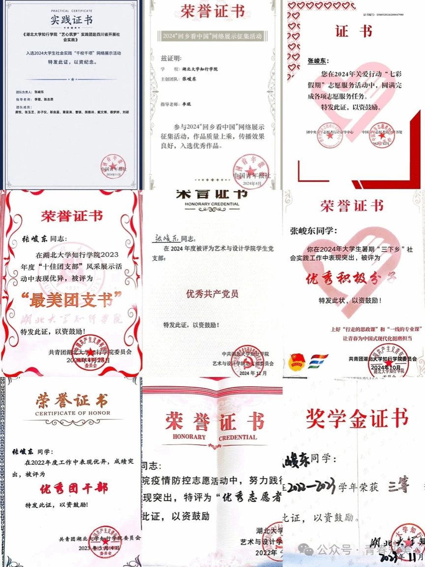 张峻东,男,汉族,中共党员,艺术学院2021级毕业生。任班级团支书,曾任院第三党支部副书记,政治素养过硬,个人能力突出。在校期间,连续获评校奖学金,个人获"优秀共产党员、优秀团干、最美团支书"等14项荣誉称号。积极参与党团建设,带领团支部获校"活力团支部"称号;社会实践成果斐然,带队院品牌实践团队"艺心筑梦"斩获团中央、中国青年报优秀实践团队、湖北省宣讲优秀团队等12项国家级、省部级、校级表彰。始终以"艺心向党,以美育人"为信念,彰显新时代青年党员的责任担当。