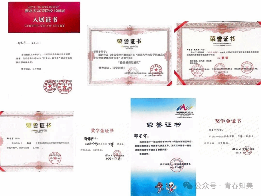 在学习中,我努力把学习放在第一位,大学两年以来,先后获得“二等奖学金”、“三等奖学金”书法作品入围湖北省高校书画展“听党话、跟党走”等荣誉。
