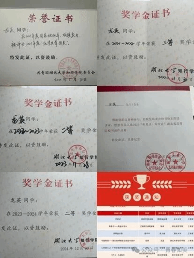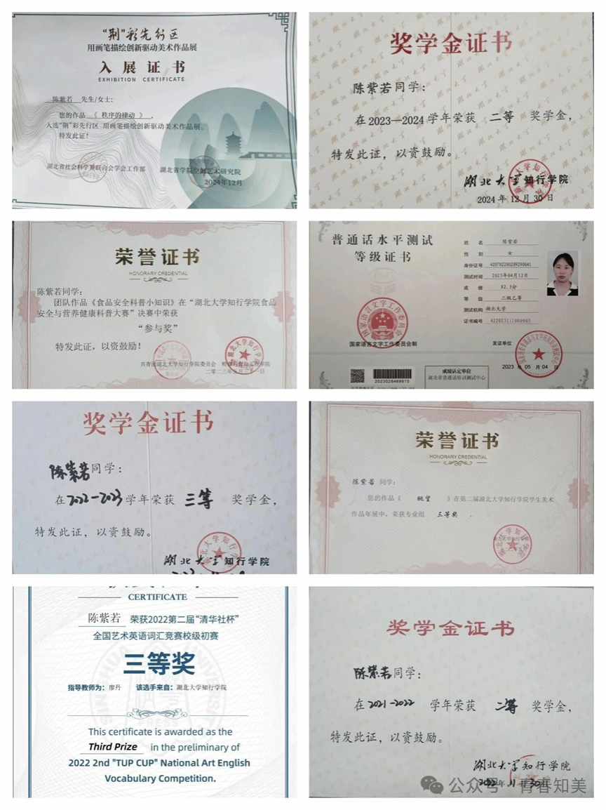 陈紫若,女,来自艺术与设计学院美术学2101班,本人政治立场坚定,学习成绩优异,工作踏实负责,态度积极向上。在学习上,本人脚踏实地,曾多次荣获校级奖学金二等奖、三等奖等;在英语学习方面,荣获第二届“清华社杯”全国艺术英语单词竞赛校级初赛三等奖;其水墨人物作品《眺望》在第二届湖北大学知行学院学生美术作品年展中,荣获专业组三等奖,版画作品《秩序的律动》入选“荆”彩先行区 用画笔描绘创新驱动力美术作品展。