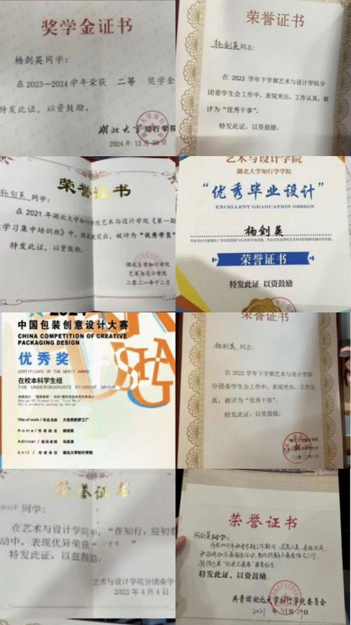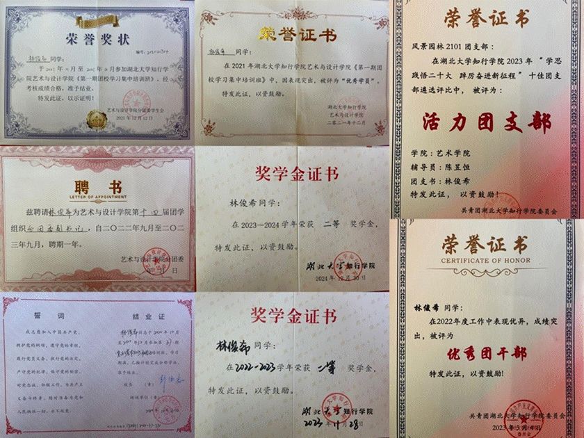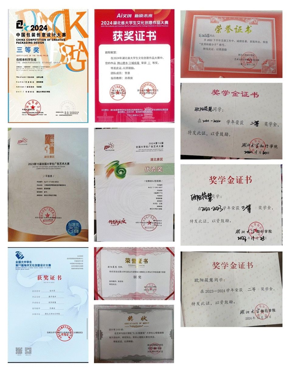 在校期间,我始终以高标准要求自己,专业成绩优异,连续三年获得奖学金,课后也积极参与各类专业比赛在提升自身能力的同时,并获得中国包装创意设计大赛三等奖、湖北省大学生文化创意大赛三等奖以及第15届大广赛平面类三等奖,第16届大广赛短视频类优秀奖等,同时也积极参与班级和学校的志愿服务活动,为他人提供力所能及的帮助。未来,我将继续努力,脚踏实地,追求卓越,为社会贡献青春力量。
