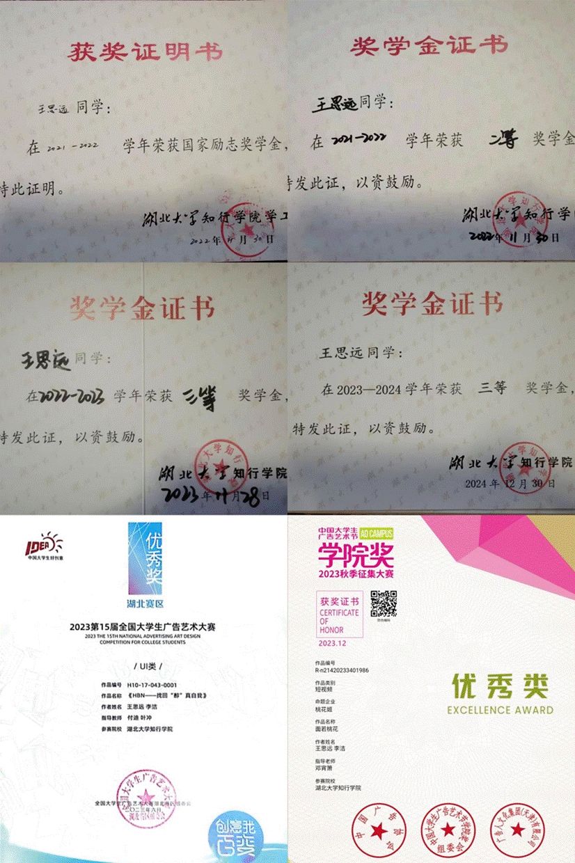 王思远,女,群众,视觉传达专业2025届毕业生。连续三年综合测评成绩在专业排名前百分之十。曾荣获一次国家励志奖学金、一次二等奖学金、两次三等奖学金。在校期间,积极参加学科竞赛,获得国家级奖励一项,获得省级奖励一项:在中国大学生广告艺术节学院奖中获得国家优秀类,在全国大学生广告艺术大赛中获得湖北省优秀奖。并且同时取得了全国大学生四六级证书、普通话二级甲等证书等。在校期间积极参加学院课外综合活动,积极进取不断提升自己。