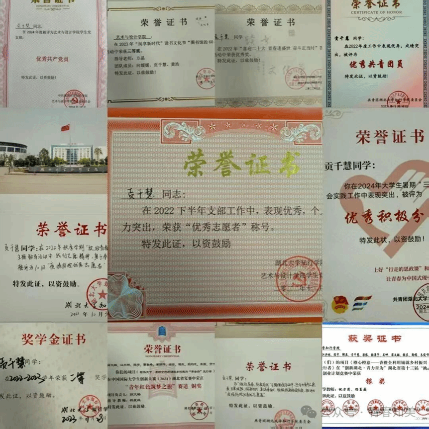 贡千慧,女,汉族,中共党员,艺术与设计学院2021级毕业生。大学四年,我始终以“知行合一”为座右铭,在专业学习上保持优异成绩,多次获得校级奖学金。专业学习之余,我积极参与社会实践,寒暑假期间深入乡村开展艺术支教。作为学院第二党支部副书记,带领支部成员创新开展“党建+艺术”特色活动,获评“优秀共产党员”称号。同时,我热心志愿服务,累计服务时长超1000小时,多次获得"优秀志愿者"表彰。这些经历让我成长为兼具专业素养和社会责任感的艺术学子。