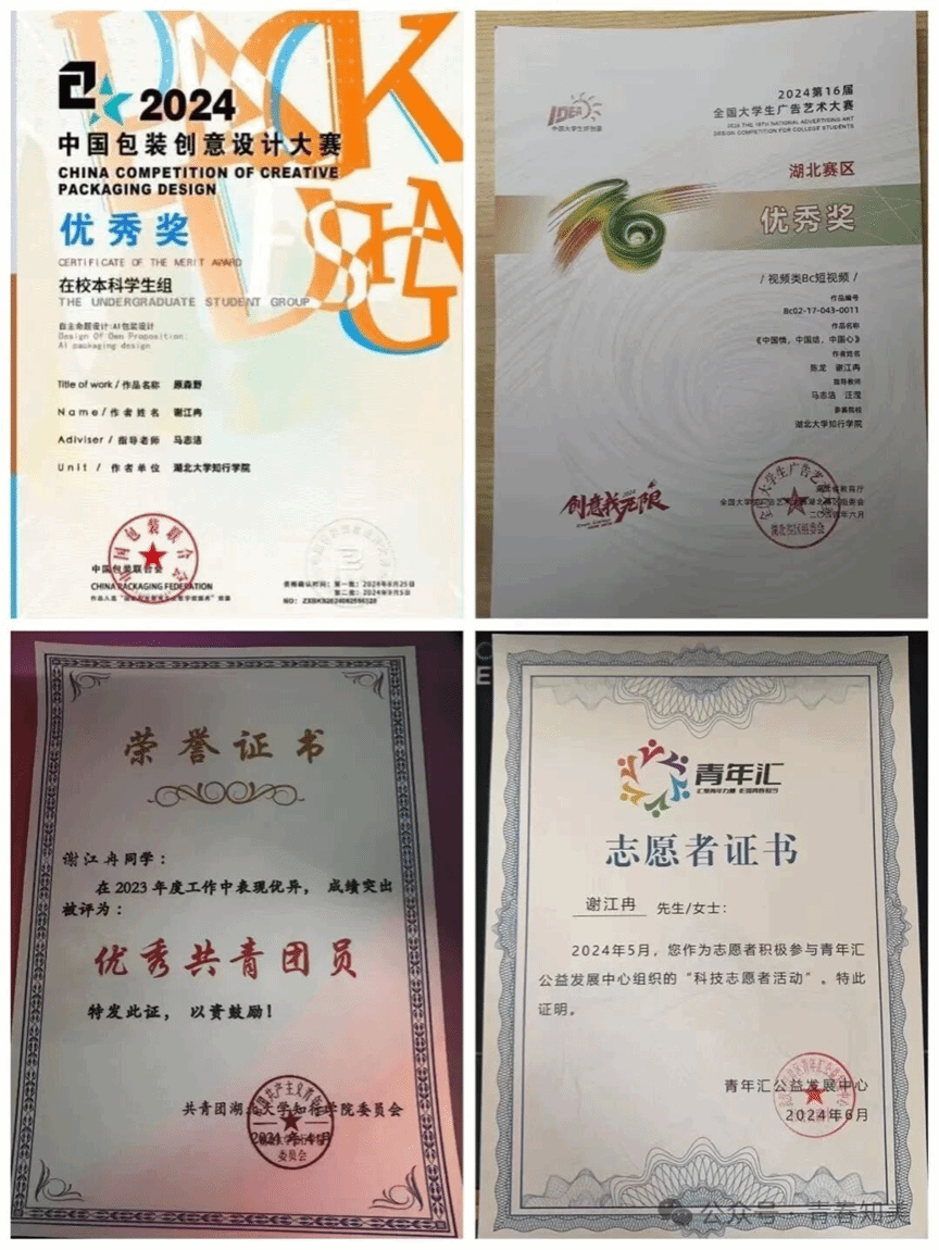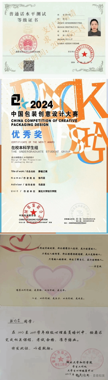 作为一名视觉传达设计专业的学生,我始终以饱满的热情投入学习和实践。2023年专升本进入湖北大学知行学院后,我更加珍惜这来之不易的学习机会,在专业课程中不断夯实基础,提升设计能力。2024年在中国包装创意设计大赛中获得优秀奖的经历,让我深刻体会到“实践出真知”的道理——比赛不仅考验创意,更锻炼了我的执行力和抗压能力。通过反复修改方案、优化细节,我学会了如何将理论转化为实际作品,也认识到团队协作和行业视野的重要性。