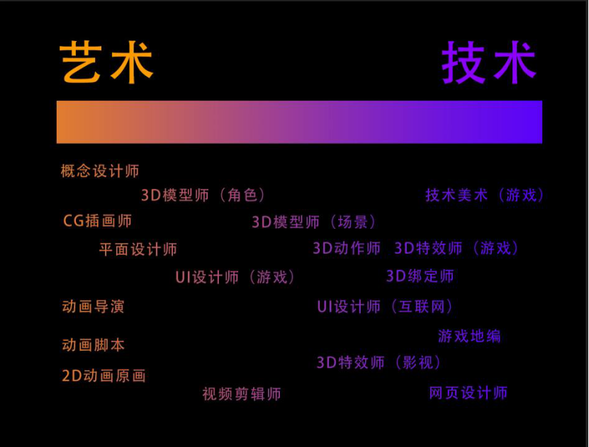 在图表中,左边的职位更偏向艺术,需要从美术方向开始学习,美术基本功和审美能力是技能核心。右边的职位更偏向技术,需要掌握各种软件的应用,越往右的职位越需要掌握编程能力。