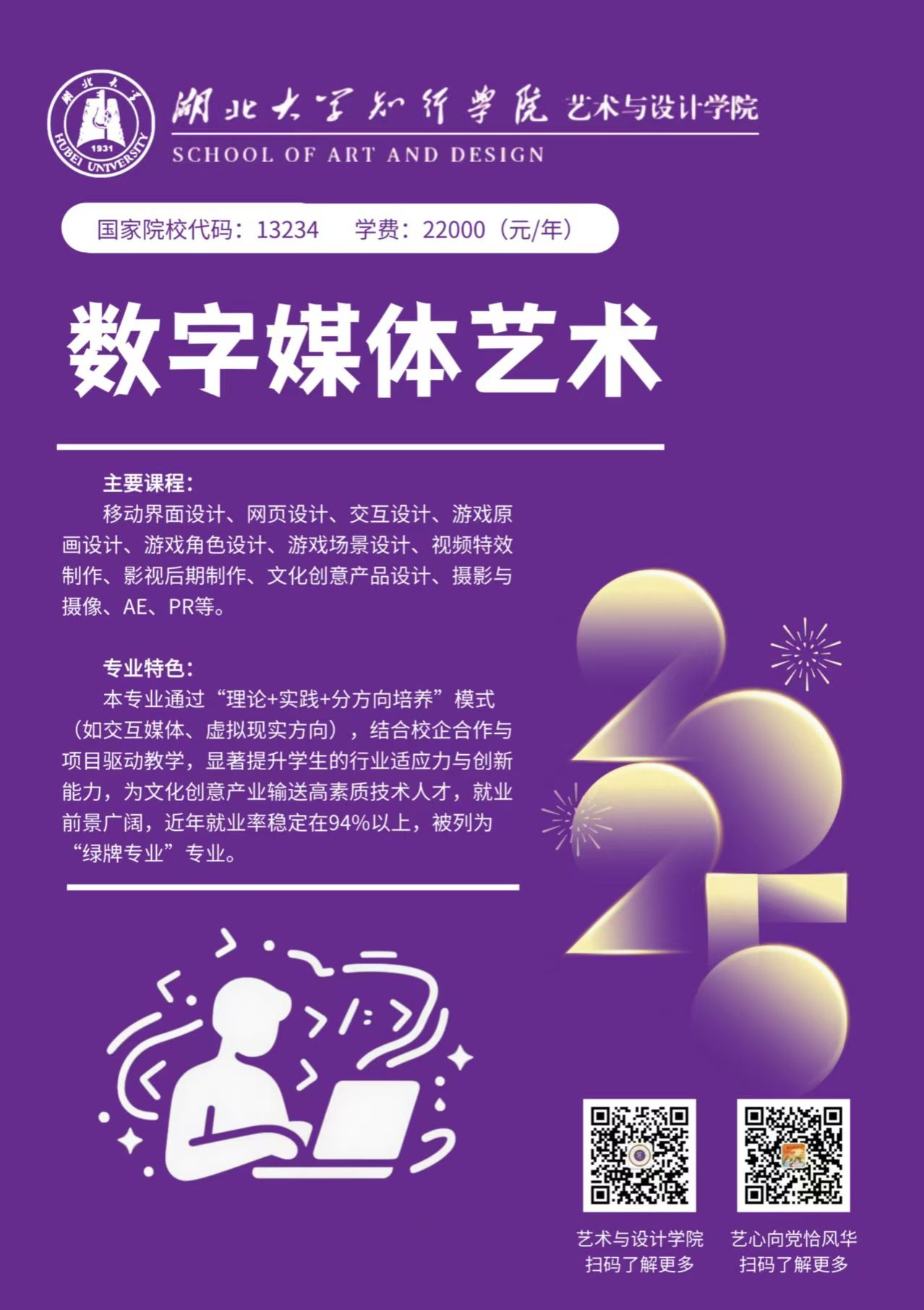 本专业通过“理论+实践+分方向培养”模式(如交互媒体、虚拟现实方向),结合校企合作与项目驱动教学,显著提升学生的行业适应力与创新能力,为文化创意产业输送高素质技术人才,就业前景广阔,近年就业率稳定在94%以上,被列为“绿牌专业”专业。